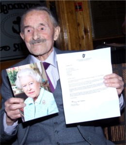 | Centenarian John Sweeney pictured with his 100th birthday greetings from Irish President Mary McAleese and Queen Elizabeth II. |