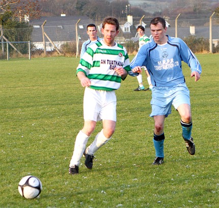 Cockhill Celtic...2 (McCarron 6, Gallagher 53) Rashenny FC...0 by Damian Dowds, Inishowen Independent, at St Mary’s Park, Cockhill COCKHILL Celtic maintained their unbeaten record in the First Division with goals in either half from Liam McCarron and Mickey Gallagher giving them a comfortable 2-0 win at an icy St Mary’s Park on Sunday. At 2-0 down, Rashenny were handed a lifeline when referee Eddie Ivers awarded them a penalty, but keeper Leo McColgan pushed John Grant’s spot kick on the bar and with that whatever chance Rashenny had of getting something from the game evaporated in the chilly air. It was a game of crunching tackles: not the crunch of boot on shinguard, but the crunch of ice underfoot. While the players had little apparent problem in keeping their feet, the frozen pitch had a layer of icy slush with skinned knees and grazed thighs the order of the day for anyone who committed to a sliding tackle. |