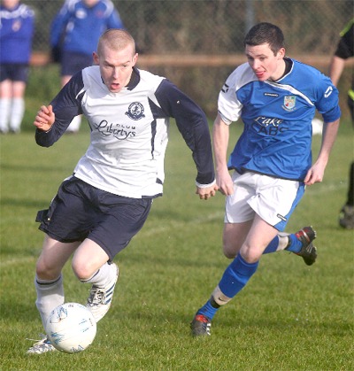 intelligence and an eye for goal. Beginning brightly, Buncrana were first to threaten when Gerard Boyle knifed his way through the middle before Charlie Gill came across to clear the danger. Gill was on hand again moments later to deny Damien Doherty before Boyle fired over Philip McClenaghan’s goal from distance. Doherty then expertly set-up Mickey Furey - sporting gloves on a cold afternoon - but the Buncrana striker failed to work the goalkeeper from sixteen yards, clipping his effort wide of the target. Sluggish Greencastle sparked into life after twenty minutes when John Gillen and Tom Casey combined well to release Matthew Henry on the right before the talented playmaker skipped past a defender to cross for Michael Barr, who opened the scoring from ten yards. The goal settled Greencastle with the impressive Barr and Henry tandem increasingly dominant in midfield. |