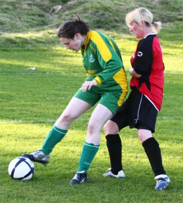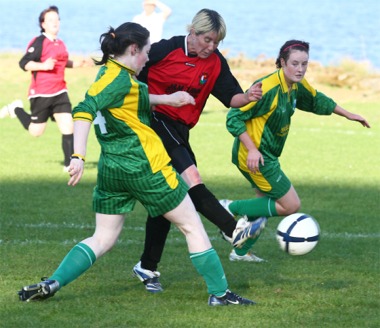 Moville Celtic 2 (McDaid, Farren) Sea Rovers 4 (Stevens 4) Caoimhinn Barr reports from the Bayfield (Photos: Herbie Barr) A PAULINE Stevens master class propelled the Sea Rovers girls to a fantastic 4-2 victory over Moville Celtic at sunny Bayfield last Thursday night. The veteran striker fired four goals, shredding the home defence time and again, during a clinical display of finishing in a pulsating Ladies First Division clash. With stand-in keeper Danielle Carey between the posts, Moville Celtic could not handle the superior guile and power of Stevens, who played on the shoulder of the home defence, running through on goal on numerous occasions. Lawrence Harkin’s Moville girls, who replied with a goal in each half from Debbie McDaid and Orla Farren, were in contention right up until the final whistle but a host of amazing saves from Sea Rovers keeper Ann Marie Coffey sealed the points for the Malin Head club. The home team, driven on by Lisa Burns and Michelle McLaughlin, controlled possession for much of the second-half but they could not convert their dominance into goals as Coffey kept Sea Rovers heads above water. |