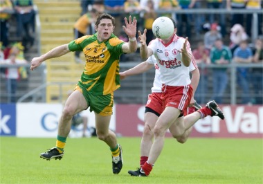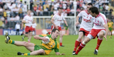 Donegal...2-6 Tyrone...0-9 by Damian Dowds at St Tiernach’s Park, Clones (Photos: Evan Logan) DONEGAL defeated Tyrone on Sunday to qualify for their first Ulster final in five years. Two second half goals, the second in injury time from substitute Dermot Molloy, gave Donegal a three point win over a Tyrone side that was seeking their third successive Ulster title. The manner of the victory will have been pleasing to Donegal manager Jim McGuinness as his team showed maturity and concentration to stick to their guns even when it looked like Tyrone would annihilate them in the opening half hour. Mickey Harte’s experienced side started at a hundred miles an hour racing into a four point lead and leading by 0-6 to 0-1 after 26 minutes. Indeed, it could have been much worse for Donegal as Tyrone hit six wides by the half hour mark: they should have been much further in front before Donegal started their fightback. The introduction of substitute Michael Hegarty conincided with an improvement in Donegal’s all round play. Although the Kilcar veteran was guilty of dawdling and letting Stephen O’Neill in for Tyrone’s sixth point, he put in perhaps his best ever performance in a Donegal shirt: he intercepted Tyrone attacks, won a series of scorable frees and showed a range of passing that, when everything is taken into account, will surely secure him the number 11 shirt for the Ulster final versus Derry. |