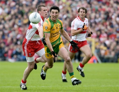games as opposed to 1-32 conceded. Donegal drew first blood on Sunday when Colm McFadden opened the scoring in the fifth minute when he won and converted his own free kick. Charlie Kielt responded for Derry before Donegal applied the pressure and hit two points on the spin from Anthony Thompson and Michael Murphy. Murphy’s point was a real team effort. With Ryan Bradley winning a Durcan kickout and laying it off to Michael Hegarty whose diagonal ball in was broken by McFadden for the team captain to score. Donegal were doing well in midfield at this stage. Neil Gallagher, who started in place of the injured Kevin Rafferty, was winning a good share of ball and Paul Durcan was hitting a mixture of long and bullet-like shorter kick outs. Rory Kavanagh, who had been an injury doubt beforehand, was withdrawn before half time, and his replacement Martin McElhinney had his best game of the championship so far. |