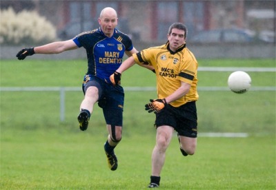 Naomh Pádraig...0-12 Naomh Ultan...0-8 by Dónal Campbell in Ture ON A dreary night for football, Naomh Pádraig eked out a priceless win over visitors Naomh Ultan in Ture on Saturday evening to keep their promotion prospects very much alive. Having fallen to a shock heavy defeat to Red Hugh’s a fortnight earlier Aidan McAleer’s men went into this game needing nothing less than a win, and, thanks to the sharp-shooting of Damian Diver and some plucky defensive work, finally pulled away from the Dunkineely men in the final quarter of an entertaining hour’s football. The reward for the Muff men: joint top of the table with Naomh Ultan and a great chance of promotion. The Muff men spent most of the hour playing catch-up, despite registering the opener from a free after eight minutes – that point the first of ten from the boot of Damian Diver. Sean Furey opened Naomh Ultan’s account from play on 11 minutes, sparking a scoring frenzy by the visitors that yielded a point a minute from Dermot Gallier, Aidan Duddy and Furey again. With his side trailing 0-1 to 0-4, Aidan McAleer cut a worried figure on the sideline, his cause not helped by the dominance of Sean Blaine around the middle for the Dunkineely side. Diver and Mark Duffy pulled the Muff men back to within a point with a brace of frees, and a third from Diver on 28 minutes levelled matters. |