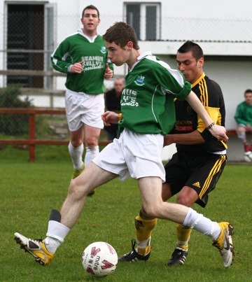 and Liam Baldrick under pressure all afternoon. Typically excellent in attack, Conor Lafferty should really have won it for the Moville second stringers but his 80th minute effort crashed off the bar from eight yards with Eccles beaten. To their credit, Dunree kept going until the end and were eventually rewarded when Ryan Bradley found himself in space in the box before keeping his cool to sidefoot past Ralph Bredin from ten yards. Moville could have been ahead inside the first minute when Christy McGeoghan headed Conor Lafferty’s cross over the top after good foraging on the edge of the area by Kevin McDermott. Dunree could have broken the deadlock themselves less than three minutes later but Thomas McKinley skewed wide after being put in the clear by an incisive Philip McGuinness pass. Home keeper David Eccles was out quickly to save at the feet of Moville frontman Kevin McDermott before ambitious Shaun Doherty set his sights high and wide from all of forty yards. |