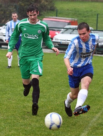 post and tapping in the rebound himself. Gerard McLaughlin almost put Steven McCarron in the clear soon after but Gweedore keeper McKelvey was out bravely to stop the young Inishowen midfielder. Minutes later Paul Hegarty's Swifts were two clear when Gerard McLaughlin expertly dispatched a penalty, awarded after David Ward's rash tackle on Steven McCarron. A Ciaran McFadden lay-off was then volleyed goalward by Gweedore wireman Oran McNelis but a smart save by Quigley's Point keeper Lawrence Lynch preserved the home side's advantage. |