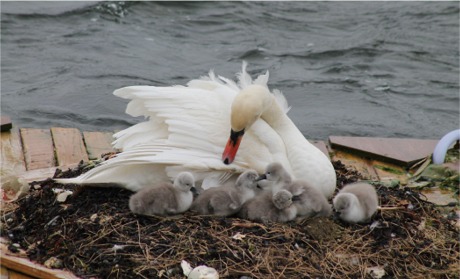 Mother swan watches over her five