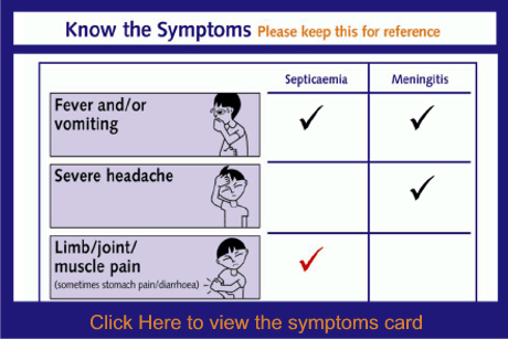 symptoms of meningitis and septicaemia, particularly