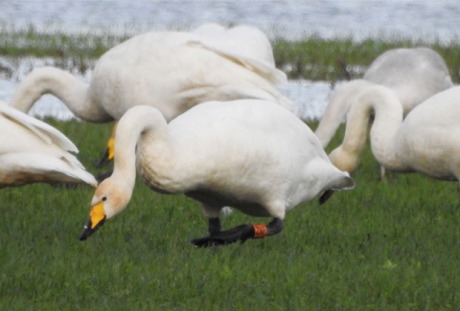 of a whooper swan with a ring on its left leg. |