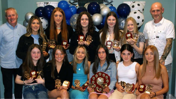 Under 15 girls team showing off their trophies. |