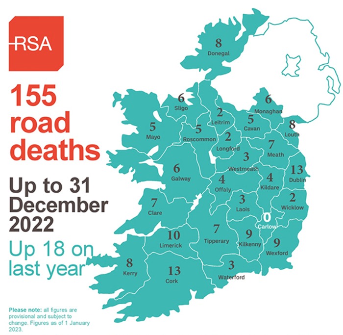 A total of 155 people died in 149 fatal road collisions in 2022 compared to 137 deaths in 124 fatal road collisions in 2021. This represents an increase of 18 deaths or a 13% rise in road fatalities compared to last year.