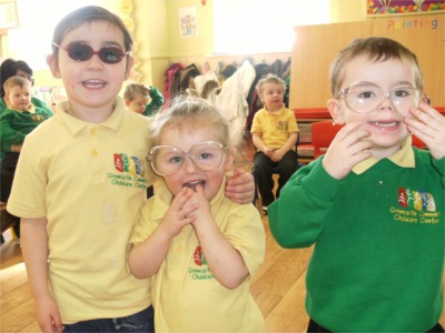 Eye see you...Children from Greencastle Community Childcare have great fun trying on these big specs during a recent visit by local optician Marie McQuaid.