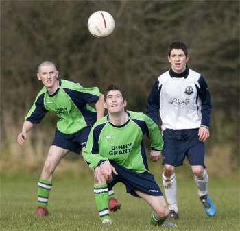 shins and his defence cleared the danger. Buncrana had another good chance on 27 minutes when McDermott came 30 yards off his line to meet a long ball over the top. He beat Kieran McDaid to it, but the ball spilled to Stephen McHugh and with McDermott scrambling back McHugh chipped the ball over the bar. But having been under the cosh for so long, Illies took the lead after wining their first corner on the half hour. Paddy Doherty swung the ball in and Niall McDaid rose highest to power a header to the net for a 1-0 lead. |