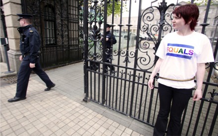 herself to the gates of Leinster House in protest