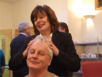 Theresa O'Hagan gives a Indian Head Massage to Sean Cannon.