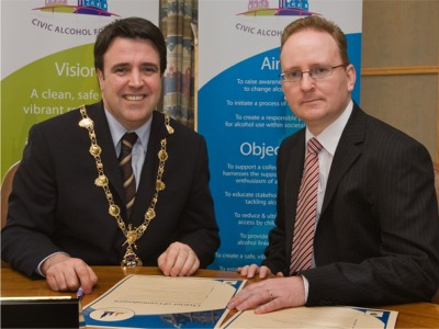 Derry Mayor Cllr Gerard Diver pictured with Eamon O'Kane from the Civic Alcohol Forum at the launch this week of a new Charter of Commitment to help eradicate problem drinking in the city.