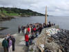 From left, Shroove's Charlie McCann, Mickey McGuinness from Derry City Council's Community, History and Heritage project, and Derry genealogist, Brian Mitchell. New Brunswick archivist Denis Noel pictured with Greencastle's Joy McCormick. The crowd gathers at the end of the pier to see the Fid up close. Locky Morris and daughter Edan meet locals John Farren and Paddy McIlroy. A view of Moville's newest monument from Montgomery Terrace.