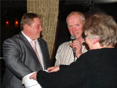 Johnny Pratt of Crana Fireplaces, Buncrana, draws the winning ticket in the draw to win a new fireplace organised by Sheephaven Mummers in Dunfanaghy. The lucky winner was Rose Doherty of Kilmacrennan.