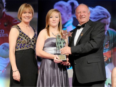Moville's Niamh McLaughlin is presented with the Ulster Young Player of the Year trophy by Cumann Peil Gael na mBan president, Pat Quill. Also pictured at the TG4 O'Neill's Ladies Football All-Star Awards 2009 in Citywest Hotel, Dublin, was Mary Davis, managing director of Special Olympics Europe. Photo: Brendan Moran.