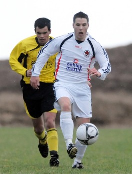 Glengad’s run is even fresher in the memory, so it was no surprise to see great commitment from both sides on Sunday. Perhaps it was the calibre of the opposition, but Glengad made a nervous start to the game. Liam Davenport combined with Andy Porter to fire an early shot across the bows of Liam McClean’s side. Slowly, though, the hosts played their way into the match and on ten minutes there was a half-hearted hand-ball appeal, but Seamus Doherty’s intervention was more ball to hand than hand to ball. On 16 minutes Glengad’s players caught the eye with a sweeping move that ended with Jason Doherty’s cross to the back post where Patrick McDermott was waiting to strike but, luckily for Redcastle, Tracey tracked the Glengad midfielder’s run and hooked clear. Playing in an all white with red and black trim outfit, Redcastle’s play was as often as smart as their away kit. Bell’s side are never more dangerous than when the other team have the ball and after a swift counter attack in the 22nd minute fullback Liam Davenport stung Michael McLaughlin’s palms. |