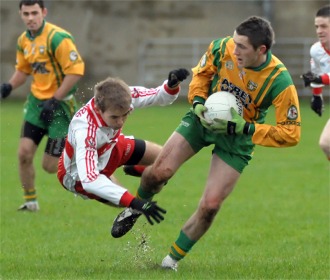 Derry...0-13 (E. Browne 0-5 (2 frees); E. Lynn 0-3; S. Bradley 0-3 (1 free); G. McShane 0-1; P. Cartin 0-1) Donegal 0-13 (S. Griffin 0-5 (4 frees); K. McMenamin 0-3 (2 frees); D. Walsh 0-3; B. Boyle 0-1; N. Gallagher 0-1) By Damian Dowds, Inishowen Independent, in O’Cahan Park, Dungiven NEITHER snow nor freezing winter rain can get in the way of the McKenna Cup, it seems as Ó Cathain Park in Dungiven hosted the meeting of Donegal and Derry on Sunday, the first intercounty game at the venue in more than a decade. While the pitch itself was soft but playable, the hills and roadsides on the way to Dungiven had been dusted white with morning snow and a couple of heavy showers at half-time and in the second half made conditions extremely difficult for both sets of players. But they battled on and served up an entertaining game, albeit one where the new rule that sees yellow-carded players being replaced had a major bearing on the outcome. While Donegal had the better of the early exchanges, they didn’t make the most of the scoring chances that came their way while Derry managed to find their scores easier. The home team were well worth their 0-8 to 0-5 half-time lead, and they led by 0-11 to 0-8 midway through the second half when the entire direction of the game changed. |