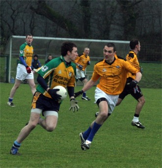 Northwest...2-12 M. Sweeney 1-0, J. Friel 0-2 (1 free), S. Coyle (0-4, 2 frees), J. Carroll 0-1, T. Alcorn 0-2, JP Gallagher 1-2 (2 frees), P. Curley 0-1 Inishowen...0-6 A. Kelly 0-3 (2 frees), O. Doherty 0-2, P. Kelly 0-1 NEIL McGee returned to competitive action at Convoy on Saturday as the Gaoth Dobhair man helped the Northwest to a facile Regional League win over a weakened Inishowen side. The appearance of the full-back, who came through his first full game since sustaining a broken toe, is sure to have heartened the watching county management team. McGee has been sidelined since before Christmas, but returned to training with the county side last week. His Northwest team were totally in command in this one-sided affair on Saturday, when a pair of goals inside the first two minutes of the second-half had the win sewn up. |
