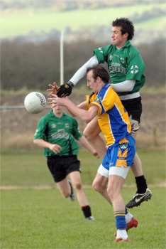 opening score in the fourth minute. Burt extended their lead in bizarre fashion. From a position 35 metres from goal and near the right sideline Ronan McLaughlin lobbed a ball towards the Naomh Bríd posts. Keeper John Gallagher came away off his line to close down unmarked full forward Ciaran Dowds and watched in horror as ball bounced over his head and nestled in the corner of the net. But Naomh Bríd’s response was swift. They swept down the field and with the Burt defence parting like the Red Sea before Moses, David Walsh was on hand to slam the ball into the net. Points from Ciaran Dowds and Joe Boyle extended Burt’s lead before Gerry McCafferty and Pádraig McDaid hit back for the visitors. Enda McDermott and Eoin Gorman traded points and Paddy McDermott closed out the first half scoring with a 29th minute free to give Burt a 1-5 to 1-3 half-time lead. Burt opened the second half scoring when Mark McGavigan pointed right from the throw-in and Naomh Bríd responded through a Paul McGrory free. McGrory was superb over the hour, giving an exhibition of high fielding and chipping in with two converted frees from his midfield birth. Goalscorer Ronan McLaughlin took over between the posts when |