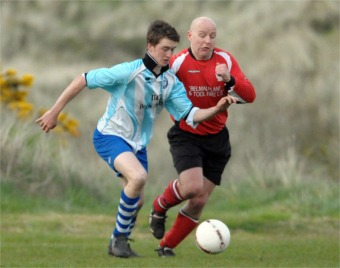 visitors. In the 10th minute Adam Harkin rose bravely with Houten to head the ball into the Culdaff net, but a late flag from the linesman saw his celebrations cut short. With midfielder Paul Hegarty spraying accurate long passes this way and that from his withdraw position, the home defence was often on the back foot in the first half. Hegarty released Raymond Buchannan with a ball in behind Raymond McFeeley but with only the keeper to beat, the Swifts striker hit straight down Houten’s hatch. Both teams struggled to get the ball down and play at times, with the easy option of the hoof often resorted to. Culdaff’s chances were limited, but when the |