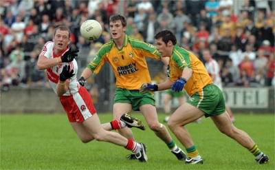 Carlow. But it was all change when Derry came to town and the scene was set for an epic ambush. From early on, it was clear that Donegal’s performance – which married work ethic and controlled aggression with composure and determination – was several notches above anything they’d shown in the championship to date. Much of the criticism levelled after each of the previous championship ties related to the apparent lack of game plan. This time around, Donegal had a clear game plan and stuck to it throughout. Karl Lacey did a masterful man-to-man marking job on Derry talisman Paddy Bradley. Frank McGlynn, Neil McGee and Barry Dunnion all took turns to mark Eoin Bradley and kept him relatively quiet. Other than the man-to-man marking on the Bradley boys, the Donegal defence employed a zonal system, where space rather than direct opponents were marked. The defensive unit was supported by midfielders Kevin Cassidy and Brendan Boyle, and half forwards Rory Kavanagh and Conal Dunne. Donegal regularly had ten men inside their own 45, denying space to the Derry forwards who had hit 3-16 against Monaghan a week earlier. But it was in attack that Donegal’s gameplan really paid off. Early ball into Michael Murphy and Colm McFadden led to a slew of scores as the Derry defence just couldn’t deal with the twin threat. Every ball that went into Murphy seemed to stick to him, so much so that Kevin McCloy (an All-Star in 2007) was substituted before half-time while Sean Marty Lockhart (an All-Star in 1998) fared no better. McFadden took his goal well and scored a couple of fantastic points. He missed some difficult chances in extra time, but never hid and was always prepared to take his shot. But Donegal had super performances everywhere on the field. Conal Dunne won a massive amount of breaking ball in the middle third and put in a tireless shift; at one time helping out in defence while at another supporting the attack. Kevin Cassidy took his goal expertly, and drove his team forward over the 90+ minutes. He was the pick of the players at centrefield, outshining illustrious Derry midfielders like Fergal Doherty, Patsy Bradley and Joe Diver. Barry Monaghan kept his defence organised, got forward to score a rare championship point, and made several vital interceptions. Eamon and Neil McGee were magnificent, while Rory Kavanagh covered every blade of grass and led by example throughout. Donegal were much the better team throughout, and took an early lead with a Michael Murphy point after two minutes. Derry opened their account with a point from James Kielt on the quarter hour and took the lead through Mark Lynch soon after. But Donegal’s response was immediate. Michael Murphy fielded a long ball in from Brendan Boyle and fed McFadden who finished smartly low to the bottom left corner. Points from Lynch and Kielt drew Derry level by the 25th minute, but McFadden hit a super effort off the outside of his left foot and Barry Monaghan had Donegal two points ahead on the half hour. Paddy Bradley responded with a point for Derry before McFadden scored yet another super point after another quick ball was played into him. Donegal got the final score of the half when Brian Roper pointed after a patient build up hand his side a 1-5 to 0-5 interval lead. Paddy Bradley’s last meaningful contribution came when he converted an easy free three minutes into the second half – the out of sorts Glenullin man was substituted on 50 minutes after taking a bang to the head. Two points from Michael Murphy and one from Kevin Cassidy had Donegal five points clear seven minutes into the second half, but Derry hit back with a point from substitute Gavin McShane. McFadden added to his tally with a super point mid way through the half. Leo McLoone shot tamely across the face of goal but McFadden caught it on the endline, twisted and turned away from his marker before pointing from a narrow angle to restore Donegal’s five point lead. Two frees from Barry McGoldrick and James Kielt drew Derry closer, but McFadden pointed to keep Donegal’s noses four clear. But Derry finished strongly in the final ten minutes of normal time. Points from McGoldrick and two from Eoin Bradley (one a 45, the other a super individual point after soloing the breadth of Mac Cumhaill Park) reduced the deficit to just a point. Murphy used his strength to win a free from Lockhart and converted it five minutes before the end, but Derry pointed through Mark Lynch and Chrissy McKaigue in injury time to send the game to extra time. Donegal looked tired at the end of normal time, but lifted by Kevin Cassidy’s goal, they found the energy reserves to go on and claim a famous win in extra time. It has been a topsy turvy season for Donegal. Defeat to Antrim in the Ulster Championship was followed by two poor, albeit winning, performances against Carlow and Clare. The dropping of Ciaran Bonner and Neil Gallagher for disciplinary breaches drew negative headlines and led the players to issue a blackout on the local media. Serious injuries to Christy Toye and Michael Maguire weakened John Joe Doherty’s hand still further. But somehow, the players rediscovered their form at just the right time and they are now among the final dozen in the hunt for Sam Maguire. After Saturday night, anything seems possible. Donegal: Michael Boyle; Frank McGlynn, Neil McGee, Karl Lacey; Barry Dunnion, Barry Monaghan, Eamon McGee; Brendan Boyle, Kevin Cassidy; Rory Kavanagh; Brian Roper, Leo McLoone; Conal Dunne, Michael Murphy, Colm McFadden. Subs: David Walsh for McLoone (59 mins); Michael Hegarty for Roper (63 mins); Johnny Gallagher for N. McGee (73 mins ET) Derry: Barry Gillis; Chrissy McKaigue, Kevin McCloy, Sean M Lockhart; Gerard O’Kane, Barry McGoldrick, Sean L McGoldrick; Fergal Doherty, Patsy Bradley; Joe Diver, James Kielt, Brian Mullan; Eoin Bradley, Paddy Bradley, Mark Lynch. Sub: Brian Óg McAlary for McCloy (34 mins); Gavin McShane for Diver (43 mins); Barr