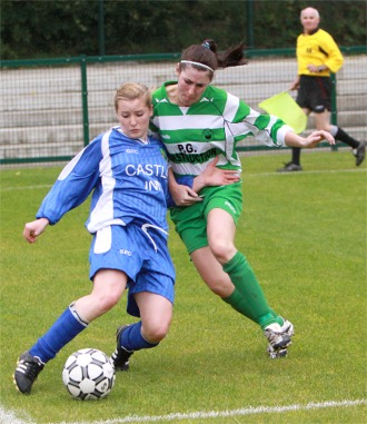 moment on there only ever looked to be one winner. Greencastle’s opening goal in the 7th minute was an eye-catching counter attack. Ciara Hegarty and Maria Kelly combined on the left to release Niamh McLaughlin through the middle and she lashed the ball high into the Cockhill net. McLaughlin had a superb game for the Chapel Lane outfit, her willingness to run off the ball led to several chances for her team. And the chances came thick and fast for the Foylesiders in the first half. Niamh Hegarty rounded Michelle Kelly and crossed for Ciara Hegarty who laid the ball off on the edge of the ‘D’ to Maria Kelly but she swerved a shot wide. Then Karen Henry threw the ball in Maria Kelly, whose first touch took her beyond the Cockhill back four. Kelly crossed for Ciara Hegarty but the full back couldn’t quite steer her shot on target. On 20 minutes Greencastle’s fans were cheering once more when their team doubled their lead. |