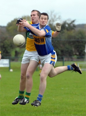 had left themselves just too big of a mountain to climb. It had been even pegging in the opening quarter. David Shovlin opened the scoring for Convoy with a free in the first minute, but a fine point from play by Barry Hegarty had the sides level within sixty seconds. Then came the penalty. Mark Duffy worked the ball well into Barry Hegarty who was fouled by Gary Patton and referee Ciaran McShea immediately awarded the spot kick. However Convoy keeper Emmett Doherty made a good save from Barry Hegarty’s shot and Padraig Porter reacted quickest to sweep away the loose ball from the inrushing Muff forwards. Still, the Muff side looked lively, with Mark Duffy in particular enjoying good possession down the left and they went back ahead in the 7th minute when Duffy found Declan McLaughlin and he fisted over the bar. Again Convoy came back, this time Thomas McHugh’s good work setting up the dangerous David Shovlin for a point to level the scores. Mark Duffy and Christopher Kyle traded points after that and by the 12th minute the sides were still level at three points each. |