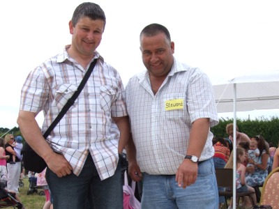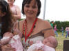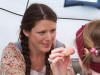 Redcastle's Sean McGonagle, left, plays the coin-tossing game with Johnny Farren. Claire Lynch, Redcastle, with her 12 week old twin babies Shannon and Caitlinn. Frank Ferns bravely puts his head on the block and awaits the wet sponges. Lily McEvaney becomes a butterfly for the day. Artist Tanya McColgan swaps the canvas for wee smiling faces at Redcastle Sports Day. Redcastle Sports Day MC Denis McGuinness, Moville, keeps things on schedule on a gloriously sunny afternoon at Foyle Park.