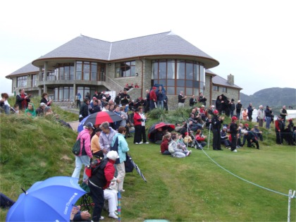 Some of the large crowds who gathered around the 18th green to watch Des Smyth finish as joint leader on Saturday during the Seniors Open in Ballyliffin.