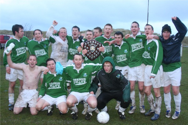 over soon afterwards. Moville were threatening and broke the deadlock after 14 minutes, unsurprisingly from a corner. Lafferty took the set piece once again and after a goalmouth scramble Celtic’s captain Kevin McDermott managed to poke home. Lafferty almost managed to add a second with a long range shot which Patrick Harkin managed to hold. Going behind seemed to invigorate Shamrocks who were more involved in the game after conceding. Their first effort of note was a shot from Emlyn Doherty that went over. Kieran McLaughlin headed wide soon afterwards. Moville were still dangerous however and Lafferty went on a good run but when he pulled the ball back none of his teammates were there to take advantage. Tony McGeady sent a good ball forward to Christy McGeoghan whose shot was saved well by Patrick Harkin. Harkin was forced into another good save from a Lafferty corner. With all this pressure a second Moville goal seemed inevitable and when it arrived it came from – what else – a corner. Lafferty’s ball in was headed in at the far post by Conor McLaughlin. Lafferty was unlucky again soon after the goal when his shot whistled just wide. Clonmany’s only other effort of note in the first half came with a turn and shot from Kevin McCarron that was easy for Sean McGuinness to gather. The game was very nearly ended after seven minutes of the second half due to the aforementioned weather conditions. When play resumed Clonmany were much improved and had a Mickey Harkin shot well saved by McGuinness. Clonmany were going forward a lot more in the second half and almost got the goal they deserved when Aiden Doherty had a header tipped over by McGuinness. Shamrocks pulled a goal back from the resultant corner when substitute Stephen McLaughlin managed to put the ball into the top corner direct from the set piece, the assist could be given to the wind. With a precious one goal advantage Moville did everything they could to slow the game down but still had a few chances. A free in from Lafferty was a danger for the Shamrocks defence but they managed to clear it. An equaliser almost came when Karl Harkin headed just wide from a Declan Grant cross. Clonmany were nearly caught on the break when Lafferty ran forward but his shot went the wrong side of the post. For the last quarter of an hour Clonmany held the advantage however a combination of the weather and resolute Moville defending meant that chances were scarce. Substitute Gearoid Doherty went on a great run and very nearly managed to tee up Kevin McCarron but McGuinness did well to come out and claim the ball. The closing moments seemed to last forever for the Moville bench but when the whistle went the joy on the faces of Eunan McDaid and his charges was plain for all to see. For veterans like man of the match John L Coyle and Jimmy Lafferty receiving the cup from Inishowen League Chairman Laurence McLaughlin must have been particularly sweet. Credit must also go to Ivan Doherty and his team who took the defeat with dignity and good grace. They also even gave this reporter a lift home and presented him with a towel. Unfortunately our photographer wasn’t there to record that presentation! For full coverage of all your weekend sport, read the Inishowen Independent. |