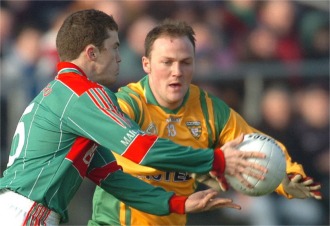 just two switches in personnel made by Brian McIver. Kevin Rafferty replaced the injured Ciaran Bonner at centre-field while Michael Boyle deputised between the posts, in place of regular custodian Paul Durcan, who was involved in a minor car accident through the week. Mayo manager John O’Mahony also made alterations from the team that lost at Celtic Park against Derry on the opening day with goalkeeper Shane Nallen and corner back Tom Cunniffe called into the first XV. Included in the Mayo line-up was wing-back Keith Higgins, fresh from his excursion with the green and red’s hurlers the previous afternoon where he scored 1-3 in their defeat to Kildare in Newbridge. A chilly Sunday evening in early spring on which the summer sun shone amid the bitterly cold conditions, an opening fit to grace the Championship stage entertained the decent McHale Park attendance. The opening quarter saw no less than nine scores and by the break that tally was stretched out to 18, but the visitors were 0-11 to 0-07 in arrears at the conclusion of the first half. Mayo were in scintillating form during the initial exchanges, splitting the Donegal rearguard with all-too-frequent regularity and the |