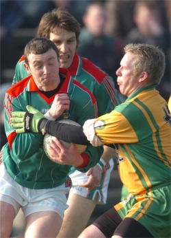Mayo 0-16 Scorers: Conor Mortimer 0-6 (3 frees), Alan Dillon 0-3 (2 frees), Keith Higgins 0-2, James Gill 0-2, Austin O’Malley 0-1, Andy Moran 0-1, Tom Parsons 0-1. Donegal 2-11 Scorers: Colm McFadden 0-7 (3 frees), Ryan Bradley 1-2 (2 frees), Eamon McGee 1-0, David Walsh 0-1, Kevin Rafferty 0-1. by Chris McNulty, Inishowen Independent, at McHale Park EAMON McGee netted a stunning last-gasp goal in McHale Park on Sunday as Donegal rescued a precious National Football League win from the jaws of defeat. With his side trailing by two points and with the stopwatch having gone over the three minutes of allotted injury time, Donegal launched one last hopeful attack on the Mayo goal. Frank McGlynn fisted to the unmarked McGee and the Gaoth Dobhair man had only one thing in mind. After collecting the pass, the centre-back made a bit of ground before picking his spot and planting an unstoppable effort beyond the reach of rookie goalkeeper Shane Nallen. |
