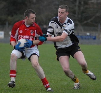 proved on Saturday. But it was Malin who had the better of things in the first half with Paul and Michael Doherty prominent in midfield. Full forward Conor Farren opened the scoring for the Inishowen men eight minutes in, before Stephen Doak forced the Malin defence into overcarrying and Raymond McLaughlin converted the first of his four pointed frees five minutes later. Malin were well on top but were struggling to turn their superior possession into scores. Indeed, they hit six first half wides to St Michael’s two. Malin’s Niall McLaughlin rose high to punch a long free over the bar midway through the half before a Ray McLaughlin free and great effort from Paul Baird under pressure on the right wing put St Michael’s 0-3 to 0-2 ahead. But the decisive score of the first half went to Malin. John Gerard McDaid broke a high ball down to Stephen McLaughlin who shot across Danny Sheridan and inside the left hand post for the game’s opening goal on 22 minutes. St Michael’s had something of a let off two minutes later when |