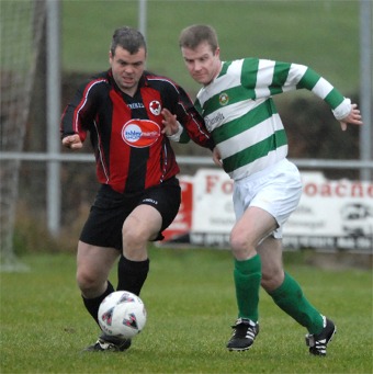 to try and make a breakthrough. Pike Rovers were made to rue their failure to make these chances pay when the home side took the lead after 72 minutes. A long punt from Crossan was nodded on by Feeney to Andy Porter whose finish sent the home crowd into raptures. The away side seemed stunned and started pressing the home defence but Redcastle were made of stern stuff with Martin Farren in particular defending heroically. For all their pressure the Limerick side couldn’t make a breakthrough and Redcastle put the tie beyond doubt with four minutes remaining. Another long punt from Crossan found Charlie McCormack who coolly placed his shot into the bottom corner to ensure a miserable six and a half hour journey home for the visitors. |