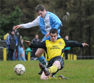 around his post. In first half injury time Chris Toner twisted and turned on the left wing and chipped a cross to an unmarked Burke who attempted the spectacular and ended up with the ordinary. The game turned scrappy at the start of the second half, then, out of the blue, Lagan produced a move of some quality to take the lead in he 52nd minute. Kelly collected Jason Burke’s through ball on right side of the Glengad box before chipping the ball impudently over McLaughlin. Stephen McLaughlin’s response was to drill a low shot wide of the Lagan goal. With the energy-sapping soil taking it’s toll the players, Glengad made a double substitution in the 54th minute, Charlie Byrne and John McDaid coming on for John McLaughlin and Ruarai Doherty. |