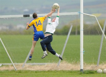 opening period. Burt dominated the rest of the half but couldn’t convert their superior possession into scores. They opened their account with a Shane Bradley free after three minutes, and the impressive Mickey McCann – who was playing as an extra defender – surged forward 60 yards to double their tally with five minutes gone. The only goal of the game came after seven minutes. Big midfielder Kevin McDermott won a Naomh Mhuire kickout and passed in to Ciaran Dowds. Dowds laid off to the in-rushing Bradley who slotted the ball coolly past Lee Boyle and into the bottom right corner of the net. |
