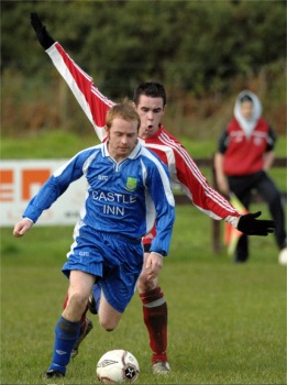 Dumoghill goal from all of forty yards. The goal was the first real shot of note from either side and it certainly livened up the match with the home side moving quickly to get back on level terms. They almost managed that in the 17th minute when Christopher O’Donnell’s clever pass split the Greencastle defence but Richard Tinney’s first time shot clipped the crossbar and flew over. But it was Greencastle who had the best of the chances in the first half and after the goal they cut through the home defence on several occasions. Paddy Keys almost got on the end of a Michael Farren free-kick in the 19th minute and a minute later he saw a stinging drive tipped over the bar by McMonagle. Keys and Farren then caught Drumoghill cold with a short corner only to see David Gordon block Farren’s shot on the line. But the home side couldn’t get the ball away from the danger area and when it was played back into the box, centre half Sean Cavanagh was on hand to score from close range and extend the Greencastle lead. Ryan McDermott fired just over in the 28th minute and Liam Kelly saw his shot ending a fine Greencastle move in the 45th minute hit the side netting, but Drumoghill’s only response was a tame effort |