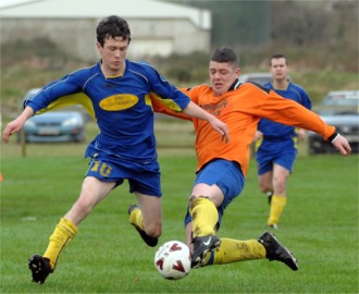 Aileach Reserves...3 (Stephen O’Donnell 9, 68, 76) Gleneely Reserves...4 (Shane Diver 33, 45, 69; Corey O’Brien 51) O’Donnell hat-trick not enough for Aileach by Jonathon Downey, Inishowen Independent, at Burnfoot Photo by Evan Logan GLENEELY secured their first win of the season in a match that was dominated by the home side from beginning to end. Aileach and Gleneely scored seven goals between them but it could have and should have been a lot more. The match produced two hat-tricks, two dubious penalty decisions and a host of missed chances in front of goal. Aileach showed their threat early on with Dermot McGlynn going close and Stephen O’Donnell’s header hitting the woodwork. In the ninth minute Aileach took the lead when Stephen McGuinness knocked in a low cross for Stephen O’Donnell to finish. The home side kept pushing for a second but found Gleneely’s back four doing well to barricade their goal. Stephen O’Donnell had another headed opportunity on goal saved by Adrian Doherty in the 15th minute before linking Martin O’Donnell with a half-chance. Gleneely upped their tempo 20 minutes in when Shane Diver created space for himself only to see his shot go wide. Two minutes later Aileach missed a glorious chance when Dermot McGlynn’s effort was parried by Adrian Duffy but Stephen O’Donnell’s follow-up was straight at the keeper. |
