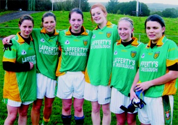 Donegal...2-9 Meath...0-6 by Inishowen Independent DONEGAL came through Sunday’s relegation play-off against Meath in Templeport County Cavan as Dominic McGlinchey’s girls had nine points to spare over Meath in a game that has been the subject of much debate. Donegal had contended that they shouldn’t have been forced to play the game, but the top brass decided otherwise. But, the Donegal girls – backboned by several players from county champions Moville – came good as two goals from sub Yvonne McMonagle saw them comfortably stave off the Royals and avoid having to face Waterford in the New Year. Donegal can tuck into the turkey safe in the knowledge that they remain at the senior grade for 2009. Niamh Hegarty opened with two points, both free kicks, while Nadine Doherty scored her first after Diane Toner turned over possession with a great delivery from Nora Stapleton setting up the chance as Donegal took control from the off. |