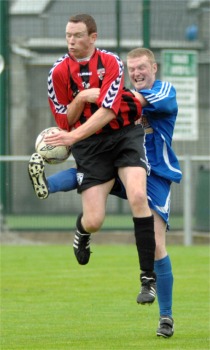 yellow after a clash with Matthew Cutliffe. Moments earlier, striker Gerard McLaughlin was fortunate to escape with only a yellow after lifting his hand to Russell Porter, with the latter’s theatrics perhaps saving the Buncrana man from dismissal. As tempers frayed, Fanad’s Arthur Lynch was also shown yellow for his part in the jostles before McGrenaghan saw red soon after. Coming into the match on the back of a narrow league win over Swilly Rovers midweek, Fanad were without the suspended Paul Nash, while Buncrana’s influential centre-back Gary Duffy failed in his bid to declare fitness. Nine minutes in and Fanad took the lead with the first noteworthy chance of the evening. Russell Porter provided the opening as it was his delivery from the middle of the park that led to quick-thinking full-back Patrick Patton nipping in around the back of the defence and, with Rory Kelly off his line, ‘Burger’ coolly lobbed the ball into the net. Buncrana were slow to start, but when they did find their rhythm, Ross Connolly had a couple of good chances, though Mark Anthony McGinley denied the front man with a good save from a powerfully struck shot. |