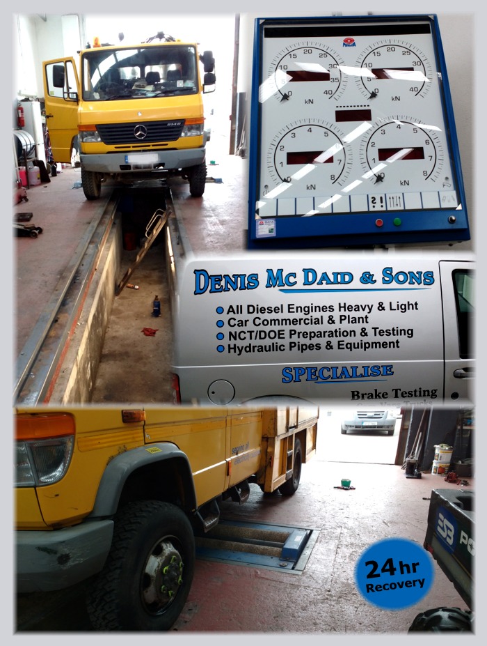 We Specialise in Brake Testing... for Cars, Vans & Trucks ● All Diesel Engines Heavy & Light ● NCT/DOE Preparation & Testing ● Hydraulic Pipes & Equipment ● Car, Commercial & Plant