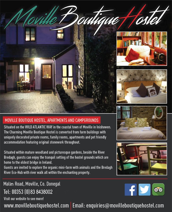 Malin Road, Moville, Inishowen, Co. Donegal Tel: 00353 (0)83 8438002 Email: enquiries@movilleboutiquehostel.com Web: www.movilleboutiquehostel.com