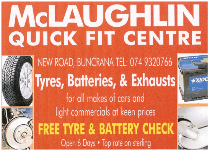 McLaughlin Quick Fit Centre New Road, Buncrana Tel: 074 93 20766 Email: mclaughlinmotorfactors@eircom.net Web: www.mclaughlinmotorfactors.ie