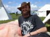 Wes Davis of the Nomad Spirit Sheepskin Company, takes a rest on one of his Kiwi Pink rugs.
