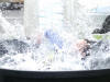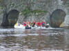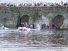 Finishing with a splash. The crowds on the bridge cheer the rafts home.