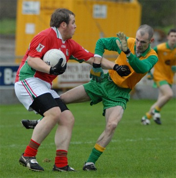 Inishowen side extended the lead further. It must be said they were helped by some poor finishing from a Convoy side who fired a couple of shots into the grateful hands of Shane Gibbons and the Convoy men didn’t raise a flag until the 17th minute when Mark Monaghan scored from play. However Robert McCartney’s 19th minute free soon had Carn back three points ahead and a great point from play from Darragh McLaughlin in the 21st minute made it 5 points to one in Carn’s favour. And it stayed that way until the break largely thanks to an excellent stop from Gibbons just before the break. A superb move from Convoy, easily their best passage of play in the game saw Michael Rodgers split the Carn defence with a great pass but Emmett Kelly saw his goalward shot pushed onto the bar by the Carn keeper and the defence got back en masse to prevent Convoy getting anything from the rebound. |